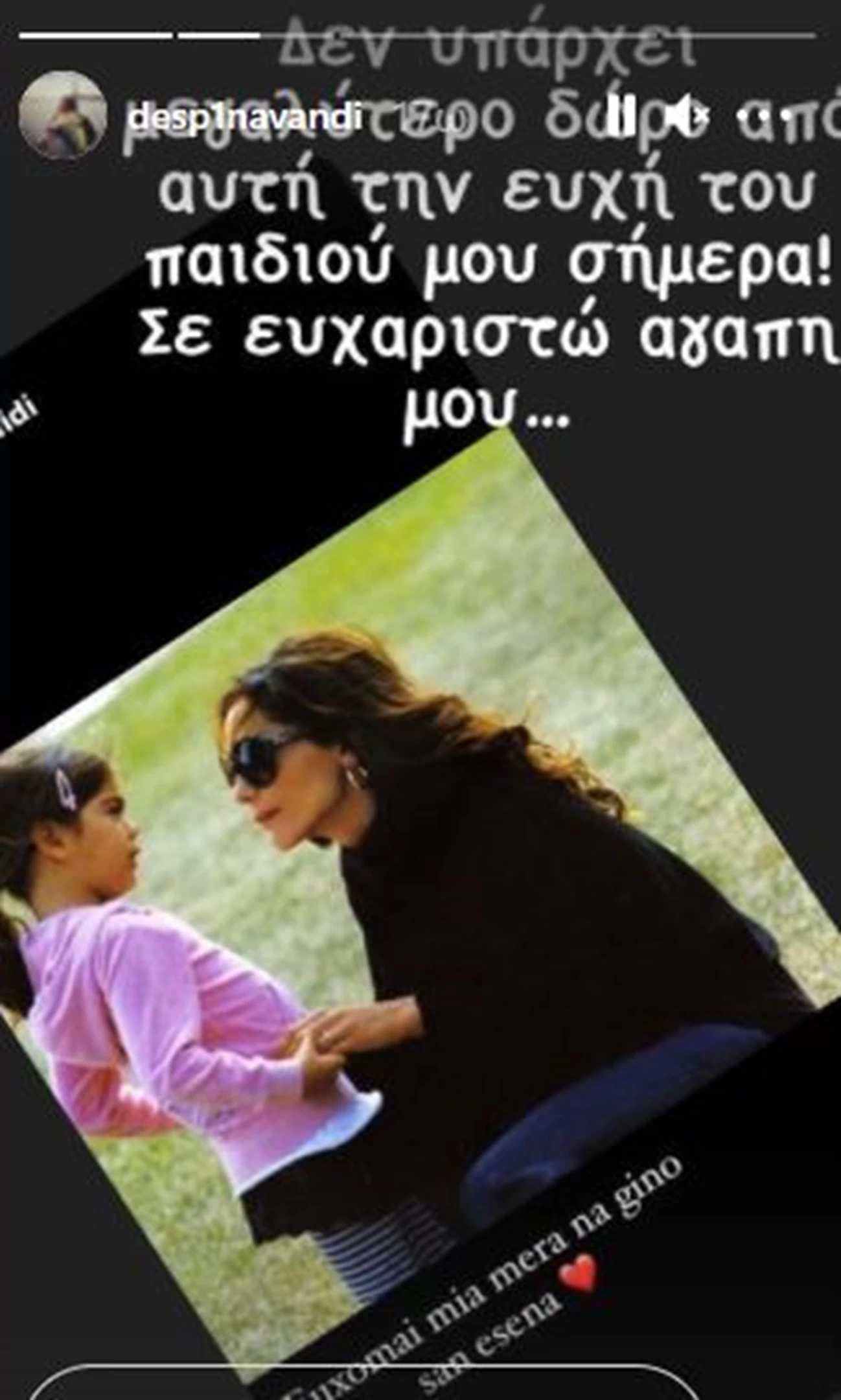 Μάλιστα, η Δέσποινα Βανδή αναδημοσίευσε και δύο insta stories της κόρης της, όπου της εύχεται για τα γενέθλιά της, λέγοντας: "Ευχομαι μια μερα να γίνω σαν εσένα".