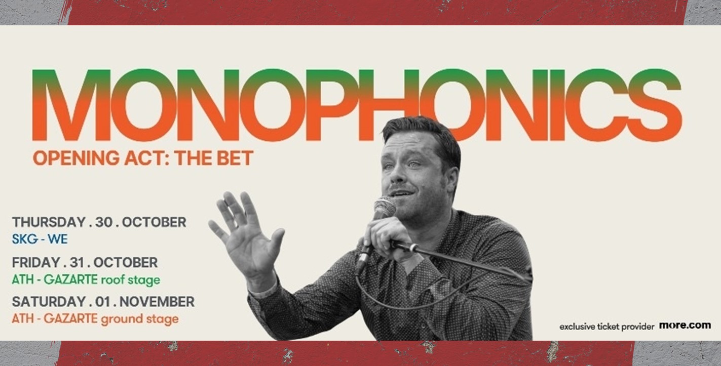 Οι Monophonics, μία από τις πιο δυναμικές μπάντες της σύγχρονης psychedelic soul σκηνής, επιστρέφουν στην Ελλάδα για τρία εκρηκτικά live. Θα εμφανιστούν στη Θεσσαλονίκη, στον Πολυχώρο Πολιστισμού & Αθλητισμού WE, την Πέμπτη 30 Οκτωβρίου και στην Αθήνα, την Παρασκευή 31 Οκτωβρίου στο Roof Stage και το Σάββατο 1 Νοεμβρίου στο Ground Stage του Gazarte αντίστοιχα. Μαζί τους οι THE BET.